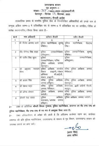 देहरादून। पुलिस महकमे हुए हुए ट्रांसफर, 8 आईपीएस अधिकारियों के हुए तबादले, IPS नीलेश आनंद भरणे को आईजी कुंमाऊ से...