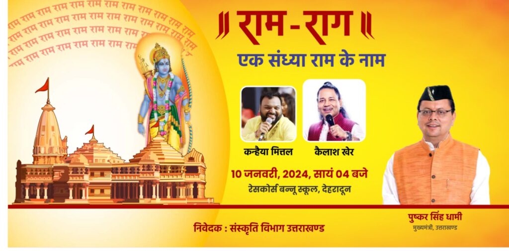देहरादून: संस्कृति विभाग द्वारा बुधवार (10 जनवरी) को देहरादून के रेसकोर्स स्थित बन्नू स्कूल ग्राउंड में शाम 4 बजे से भव्य सांस्कृतिक कार्यक्रम “राम-राग” आयोजित किया जा रहा है। इस कार्यक्रम में राज्यपाल लेफ्टिनेंट जनरल गुरमीत सिंह (से नि) एवं मुख्यमंत्री पुष्कर सिंह धामी बतौर मुख्य अतिथि प्रतिभाग करेंगे।