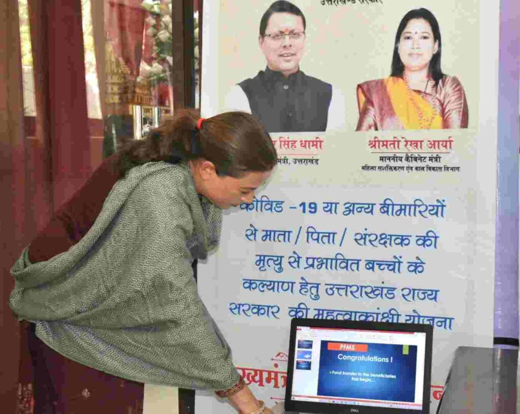 देहरादून । आज यमुना कॉलोनी स्थित अपने शासकीय आवास परमहिला सशक्तिकरण एवं बाल विकास मंत्री रेखा आर्या ने “मुख्यमंत्री वात्सल्य योजना” के अंतर्गत PFMS के माध्यम से माह अगस्त में 6122, सितंबर माह में 6098 एवं अक्टूबर माह में 6083लाभार्थियों को कुल रू0 549.09 लाख की धनराशि का डिजिटल हस्तांतरण किया गया। बात दे कि मुख्यमंत्री वात्सल्य योजना के तहत कोविड-19 महामारी एवं अन्य बीमारियों से माता/पिता/संरक्षक की मृत्यु के कारण जन्म से 21 तक के प्रभावित बच्चों को प्रतिमाह 3 हजार रुपये की सहायता राशि प्रदान की जाती है।विभागीय मंत्री ने कहा कि माननीय मुख्यमंत्री श्री पुष्कर सिंह धामी जी स्वयं मामा के रूप में और मैं बुआ के रूप में अपने बच्चों के साथ खड़े है।