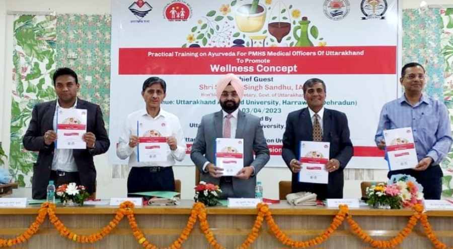 मुख्य सचिव द्वारा प्रशिक्षण कार्यक्रम में Practical Training on Ayurveda For PMHS Medical Officers of Uttarakhand To Promote Wellness Concept उत्तराखण्ड आयुर्वेद विश्वविद्यालय तथा एच0एन0बी0 उत्तराखण्ड चिकित्सा शिक्षा विश्वविद्यालय द्वारा बनाये गये प्रशिक्षण मोड्यूल का विमोचन किया गया।