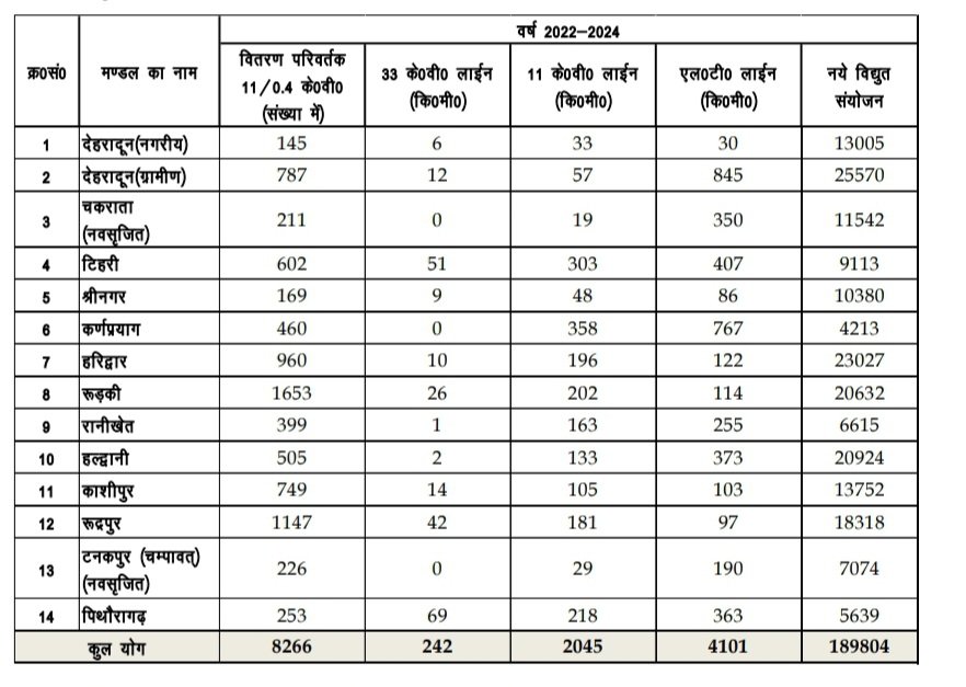 लगातार बढ़ रही मांग की प्रतिपूर्ति करने हेतु यूपीसीएल द्वारा 02 वर्षों में 04 नये 33/11 के0वी0 उपसंस्थानों का निर्माण तथा लगभग 242 कि0मी0 33 के0वी, 2045 कि0मी0 11 केवी एवं 4101 कि०मी० एल०टी० लाईनें प्रदेश भर में स्थापित की गई है। प्रदेश भर में सभी पोषकों पर विद्युत संतुलन बनाये रखने हेतु लगभग 8266 वितरण परिवर्तक स्थापित किये गये हैं। साथ ही पिछले 02 वर्ष में 1,89,804 नये विद्युत संयोजन स्थापित किये जा चुके हैं। विगत 02 वर्षों यथा 2022 से 2024 में मण्डलवार वितरण परिवर्तकों, 33 केवी लाईन, 11 के0वी0 लाईन, एल०टी० लाईन एवं नये विद्युत सयांजनों का विवरण निम्न प्रकार से है-