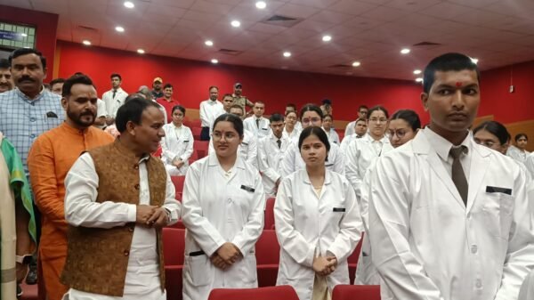 स्वास्थ्य मंत्री डॉ. धन सिंह रावत के हाथों वाइट कोट पहनने पर उत्साहित दिखे एमबीबीएस के नये छात्र-छात्राएं