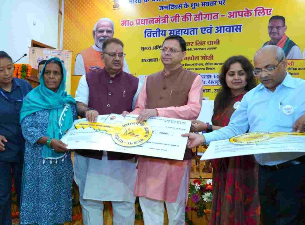 देहरादून। मुख्यमंत्री पुष्कर सिंह धामी ने रविवार को मुख्यमंत्री आवास स्थित मुख्य सेवक सदन में प्रधानमंत्री नरेन्द्र मोदी के जन्म दिवस के अवसर पर  प्रधानमंत्री की सौगात-आपके लिए’ कार्यक्रम में राष्ट्रीय ग्रामीण आजीविका मिशन के अन्तर्गत स्वयं सहायता समूहों एवं प्रधानमंत्री आवास योजना-ग्रामीण के अन्तर्गत 11 लाभार्थियों को आवास स्वीकृति पत्र, चाबी एवं घर के लिए बर्तन और सामान क्रय के लिए 05-05 हजार रुपये के चेक प्रदान किये। मुख्यमंत्री ने कहा कि प्रधानमंत्री आवास योजना-ग्रामीण के लाभार्थियों को अब घर के बर्तन और सामान के लिए 06-06 हजार रुपये दिये जायेंगे।